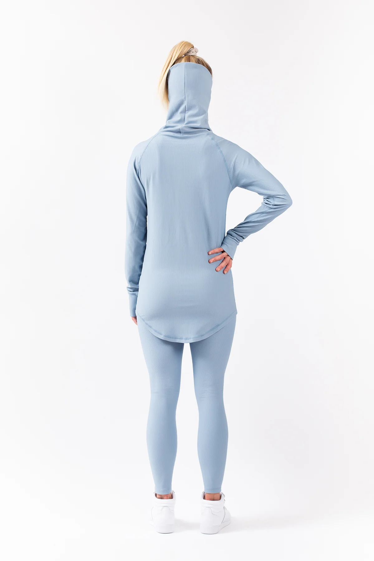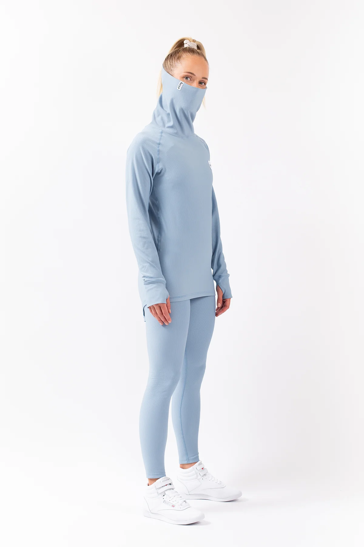 Be extra toasty in our baby blue base layer that combines streetfashion and maxed out functionality. The extended back and the integrated gaiter neckwarmer that is higher in the back, making it easy to tuck it under the helmet or beanie for warmth, protects you on cold winter days. The flatlock seams prevent chafing and the integrated thumb loops helps the sleeves stay put through all your adventures.