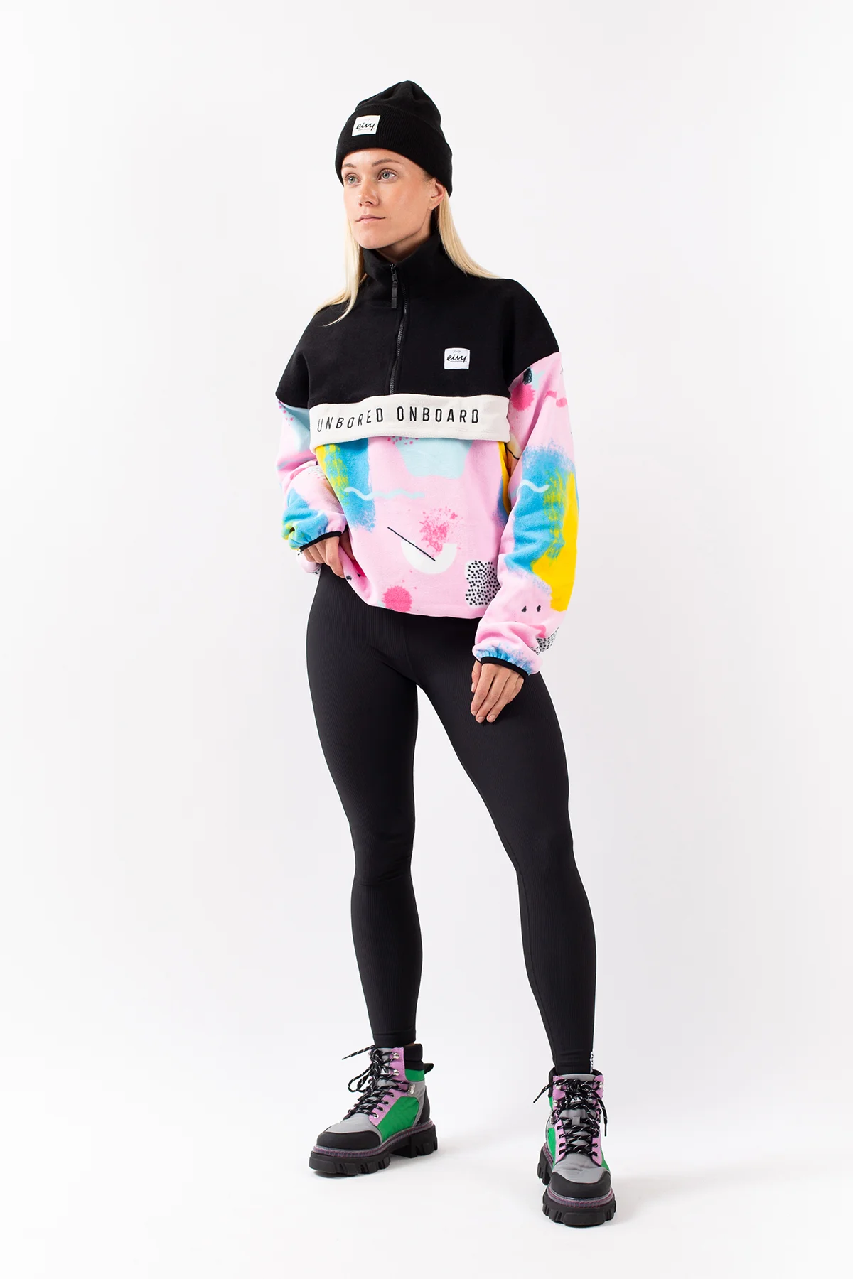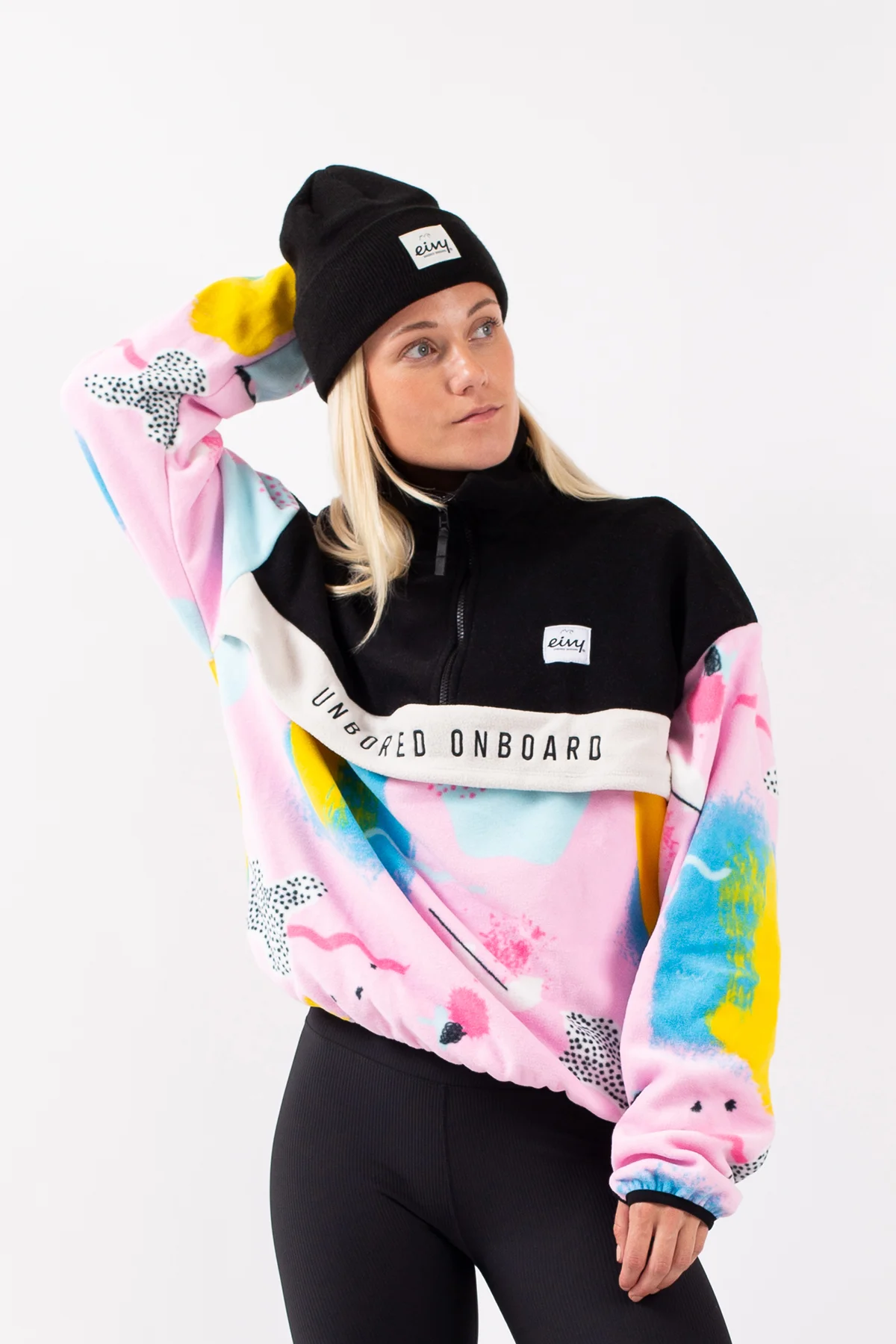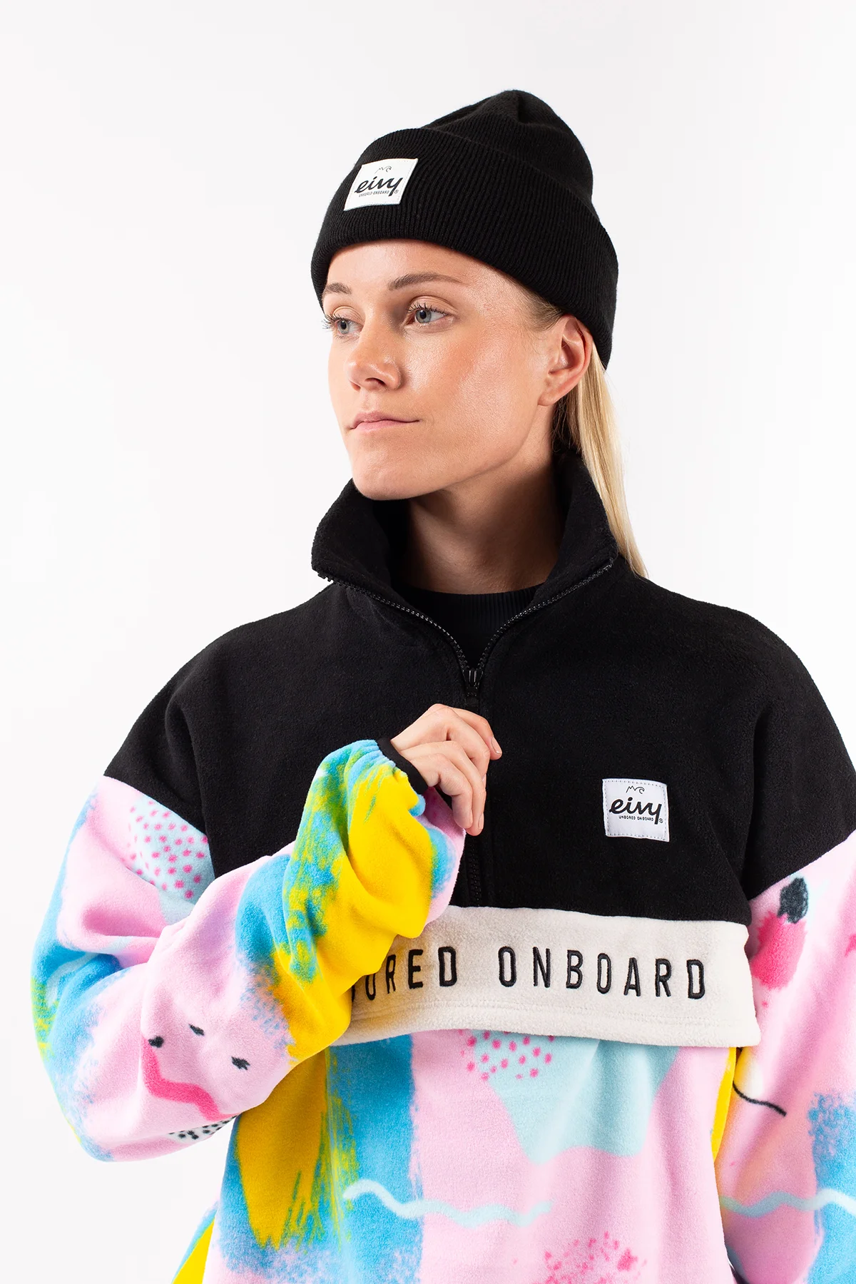 Ein angenehm weicher Fleecepullover in leicht oversized Passform für einen auffälligen Look, im 80's-inspirierten farbfrohen look. Der warme Kragen lässt sich dank den YKK®-Reißverschluss öffnen und schließen, ebenso die geräumige Fronttasche.