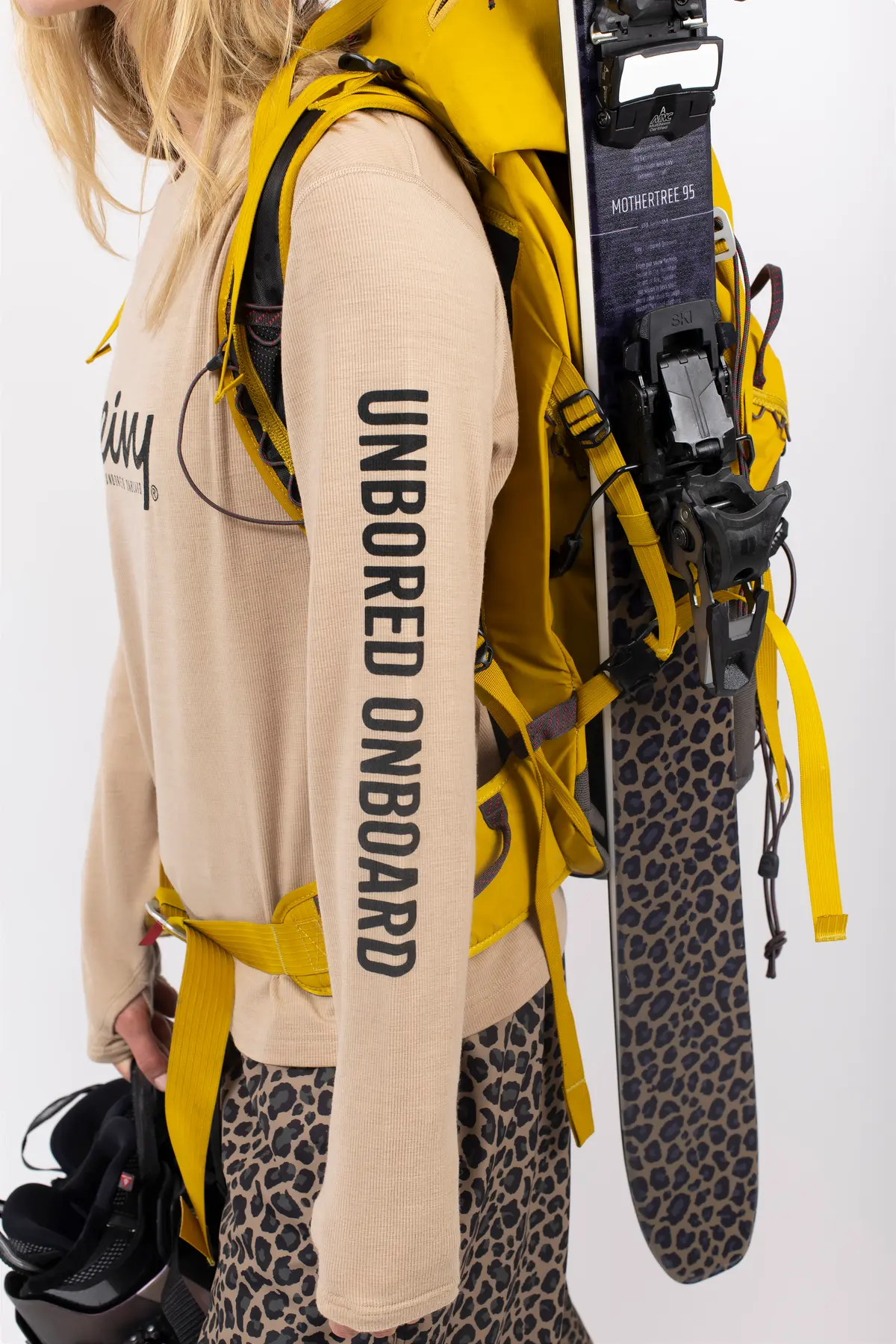 A new take on our merino wool top – now in a beige ribbed fabric with an MX-inspired design. This long-sleeved style features a straight cut and bold prints on the front and back, with graphic text running along the sleeves for a sport-driven look. Built for year-round wear, whether you're skiing, walking, training, or just living life.