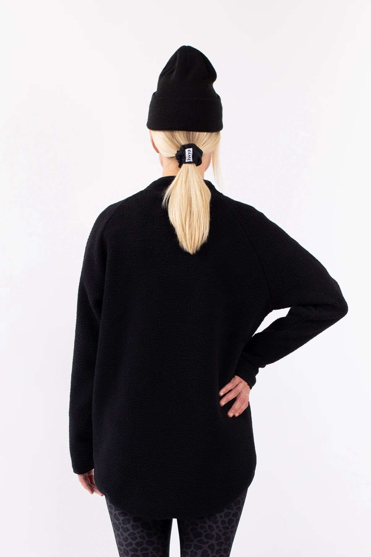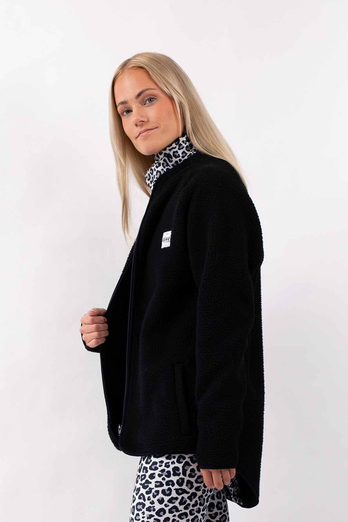 Black fleece parka in soft and warming sherpa fleece in dual layer, with fabric details on the chest, pockets and sleeves. Equipped with large pockets and a drawstring at the waist and at the bottom, to easily change the style of the jacket. The jacket works both as an outer garment during autumn days and milder weather or as an intermediate layer for extra warmth in winter.
