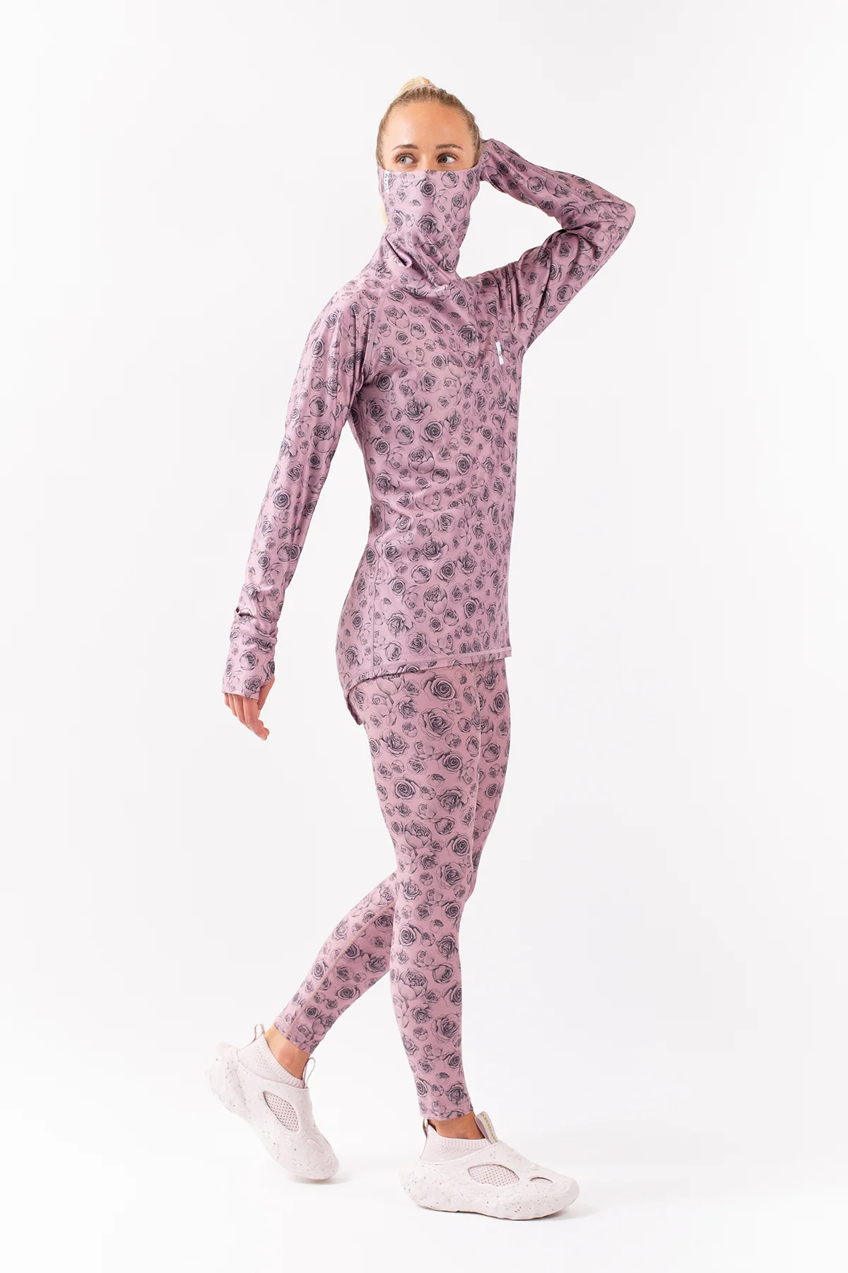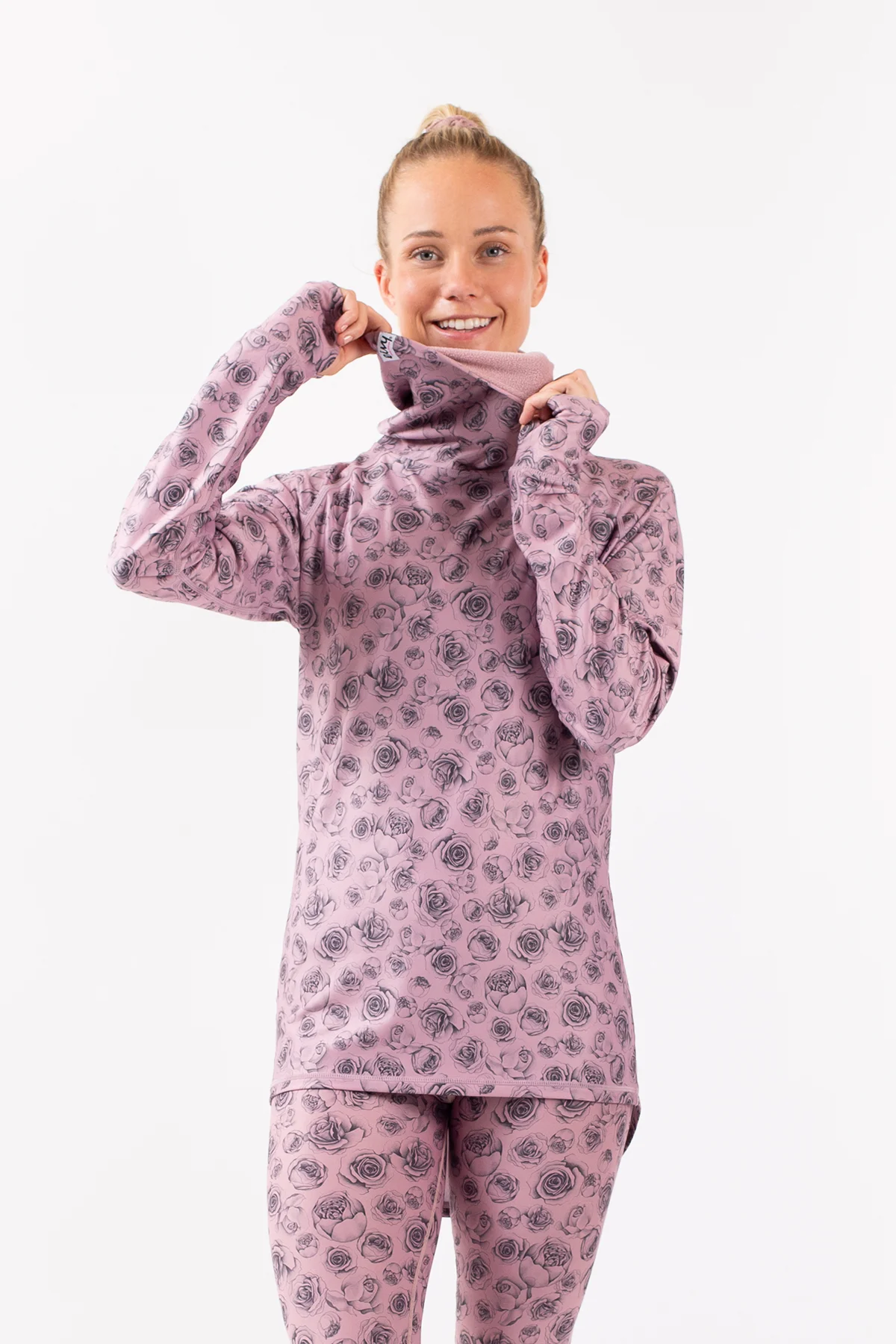 Be extra toasty in our pink base layer that combines streetfashion and maxed out functionality, in it's flower print. The extended back and the integrated gaiter neckwarmer that is higher in the back, making it easy to tuck it under the helmet or beanie for warmth, protects you on cold winter days. The flatlock seams prevent chafing and the integrated thumb loops helps the sleeves stay put through all your adventures.