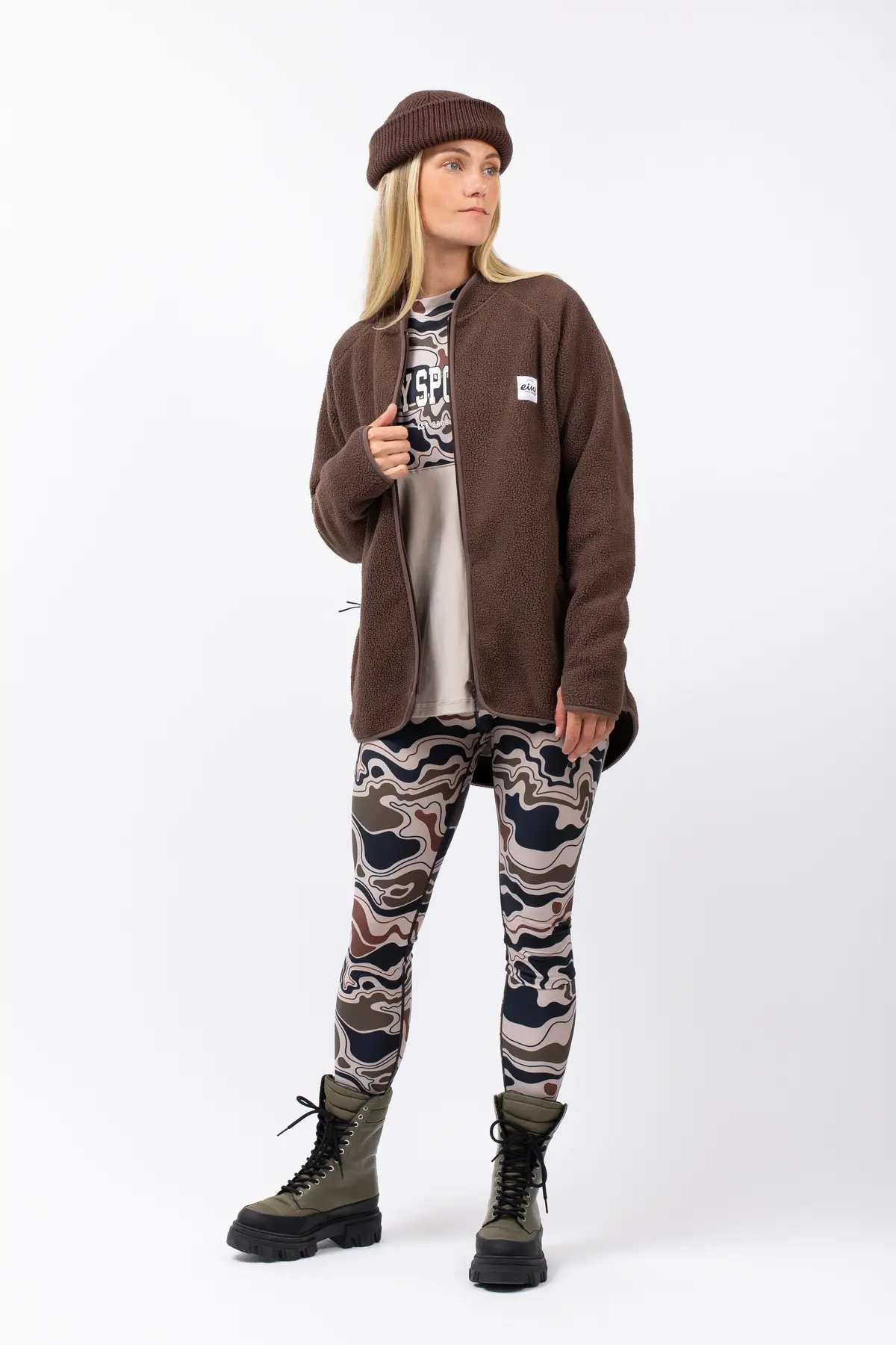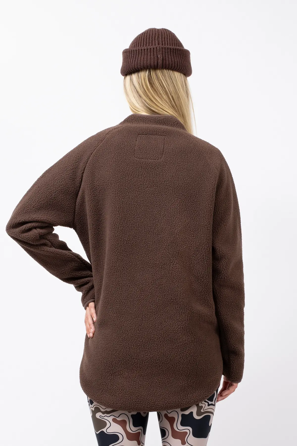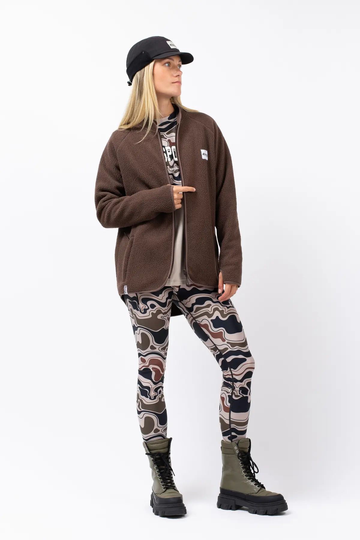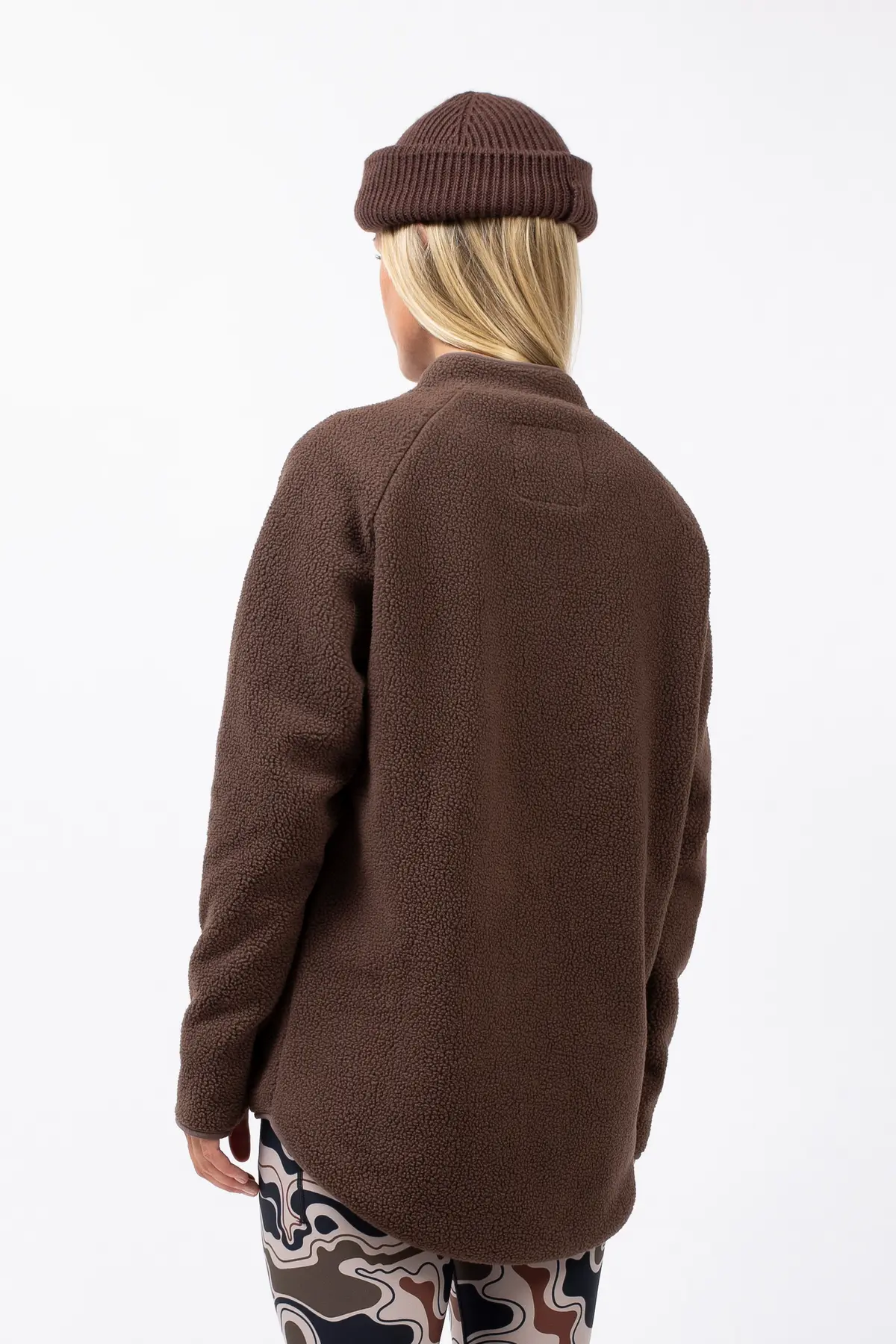 The black Redwood Sherpa Jacket is a thick and soft sherpa fleece with integrated thumbloops, YKK® zippers on the front and the pockets, raglan cut shoulders and extended back length in brown. The perfect jacket for spring and fall, or as a second layer on icing days on the mountain on your snowboard or skis.